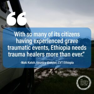 Maki Katoh, country director for CVT Ethiopia, wrote this article about the long-standing internship program that began in 2014 and has been implemented at four major universities in the country. The internships brought students from a wide range of psychology programs and physiotherapy to CVT’s centers, allowing first-hand experience serving people who had experienced deeply traumatizing events while providing students with training and clinical supervision. The internships have been enormously successful, and Maki writes, “Some students even deferred their graduation in order to attend an internship with CVT.” She adds, “With so many of its citizens having experienced grave traumatic events, Ethiopia needs trauma healers more than ever.”