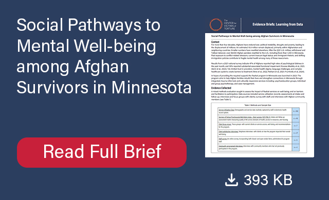 Evidence Briefs below highlight the impact of some of CVT’s innovative programming and showcase the type of learning products the Evaluation and Research Department provides. Click on the briefs below to learn more about survivors’ healing journey as they engage with CVT programs.